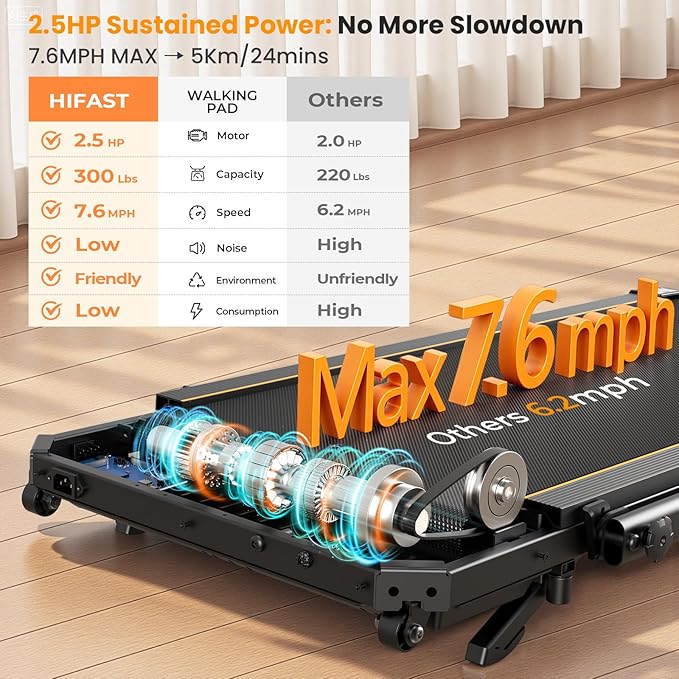 - Commercial 2.5HP Motor & 3-in-1 Treadmill - Switch seamlessly between Walking (0.6-2 MPH), Jogging (2-4 MPH), and Running (4-7.6 MPH) modes. This under desk walking pad powered by a safety-certified 2.5HP(Peak) motor with auto-shutdown protection against overheating; Walking Mode: Steady under-desk strides during work hours; Jogging Mode: Gentle cardio with reduced joint impact; Running Mode: The walking pad with 8% incline burns 42% more calories.