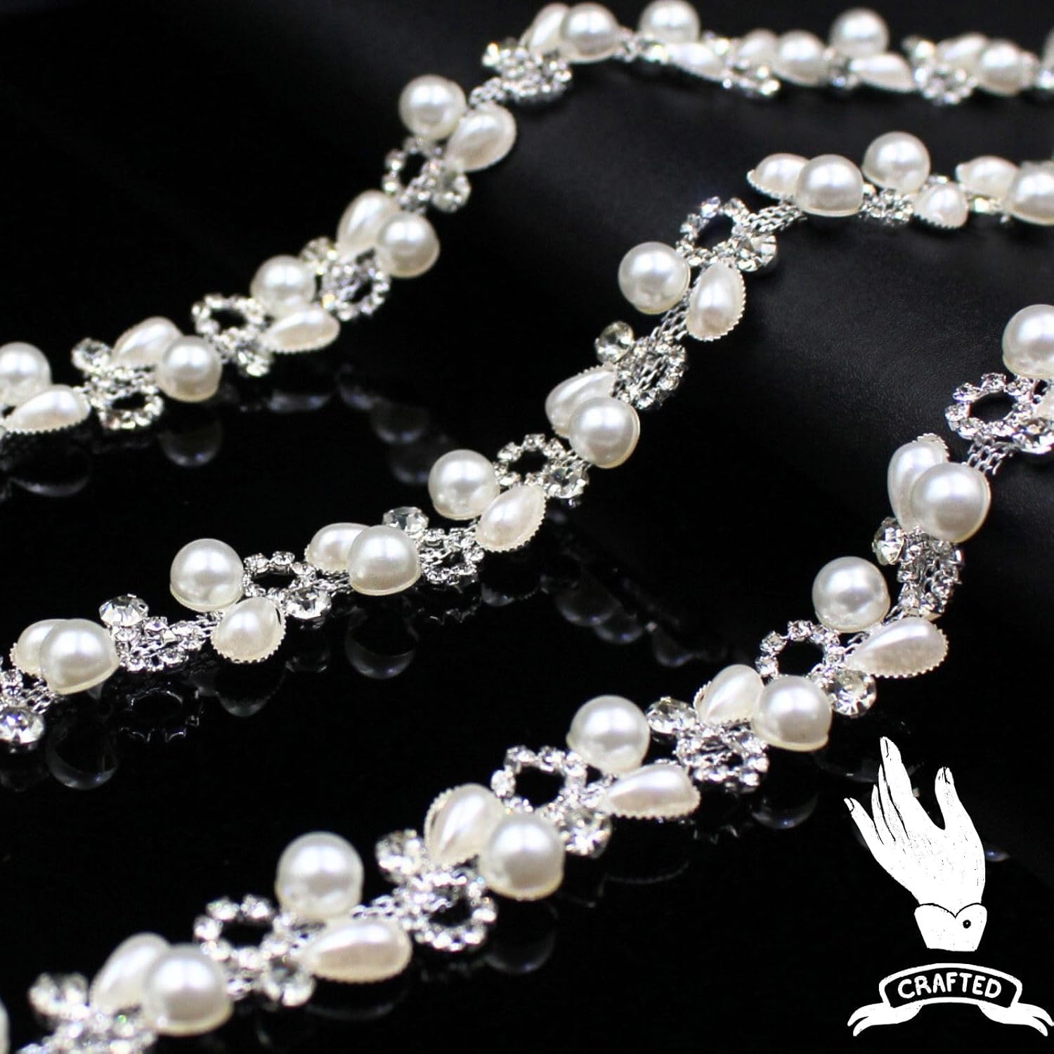 1 Yard Pearl Chain Silver Rhinestone Trim String Crystal Applique Fringe Ribbon Strips Beads Sewing Dress DIY Party Wedding Bouquet for Decoration Bridal Costume Embellishment
