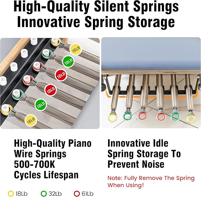 - Precision Resistance with 6 German Steel Springs Equipped with 6 German-engineered steel springs, this reformer provides smooth and customizable resistance. From core strengthening to flexibility training, the adjustable springs offer a personalized experience for all fitness levels, ensuring safe and effective workouts.