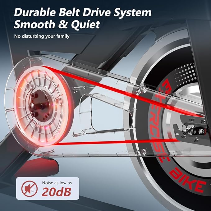 - 【Hyper-Quiet Drive System】We developed the latest technology eliminates noise to our fitness bike, controlling the sound at 20 dB even after millions of times workout. No disturbing on working, reading, and sleeping at home.