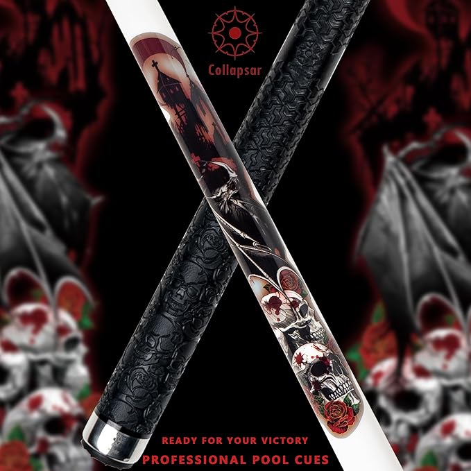 - COLLAPSAR 58" Original Skull Series Pool Cue Stick Come with a 1X1 Cue Case and joint protectors,Available in 19 - 21 ounce .