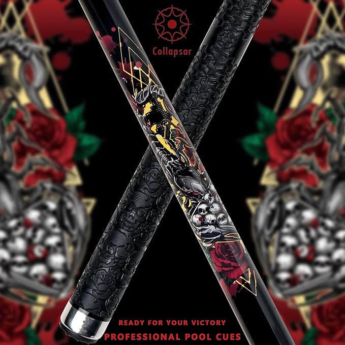 - COLLAPSAR 58" Original Skull Series Pool Cue Stick Come with a 1X1 Cue Case and joint protectors,Available in 19 - 21 ounce .