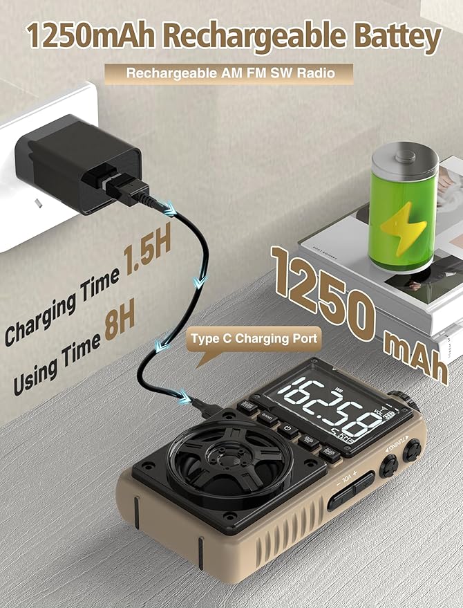 - 【1250 Rechargeable Battery&Flashlight】The rechargable shortwave radio comes with a durable built-in 1250mAh rechargeable battery,you can enjoy up to 10-12 hours of music and news on a single charge(using type-c), without the hassle of replacing batteries. Whether you're at the beach, camping, or just enjoying a picnic in the park, you can take this walkman radio with you.The rechargable AM FM radio also comes with a flashlight that allows you to illuminate the environment in case of an emergency.