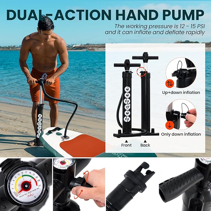 - 【SUP Accessories】 Floating paddle , double action hand pump with psi gauge, 3 removable fins, safety leash, SUP manual, repair kit and a backpack. Just put all in your backpack and you've got everything you need to hit the water.