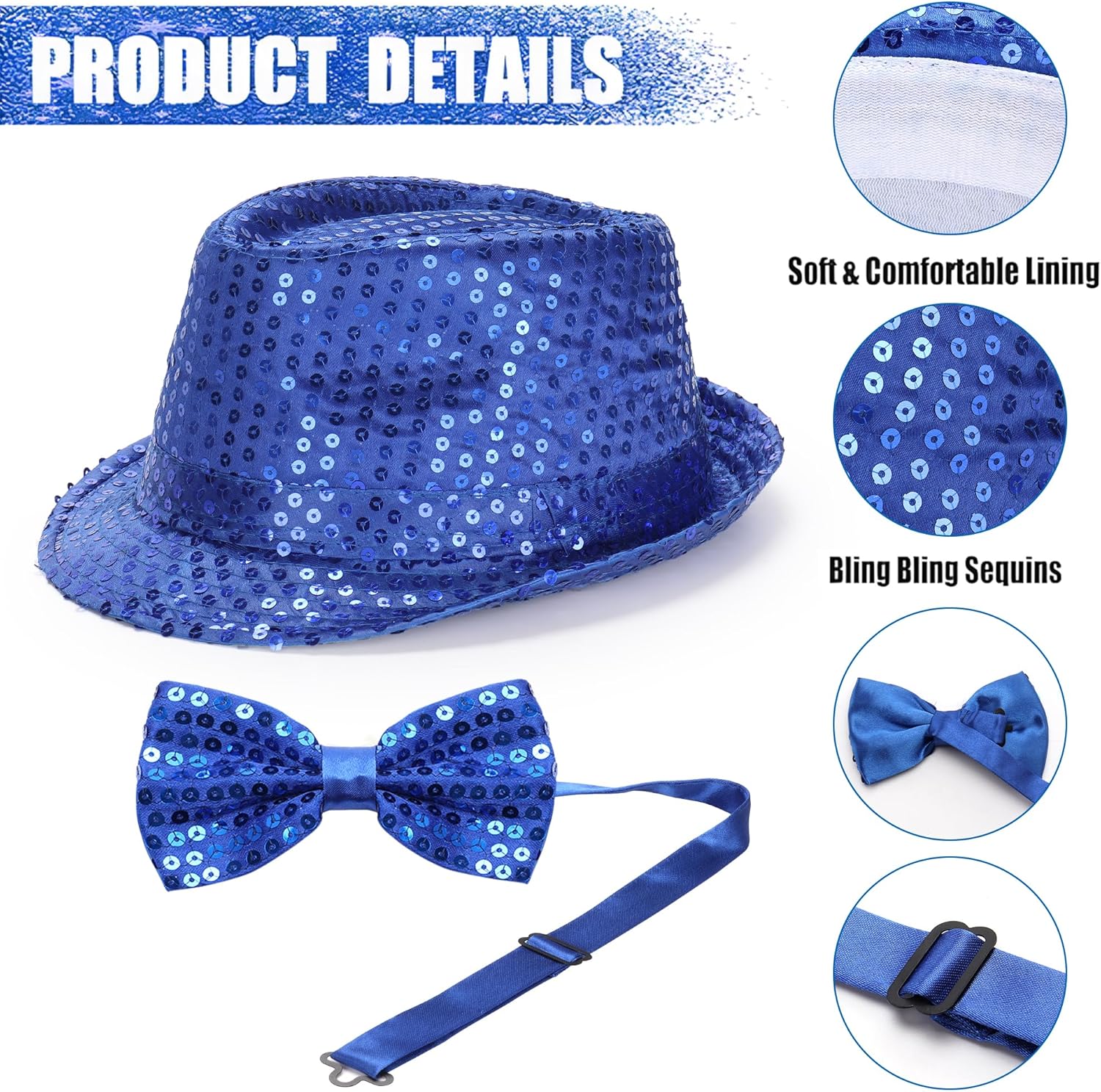 - Comfortable Material: Unisex sequin fedora hats are made of 35% cotton, 65% polyester and sequins, soft lining will be more comfortable for you to wear, Sequin bowties are made of polyester stain, with good workmanship, durable and reusable