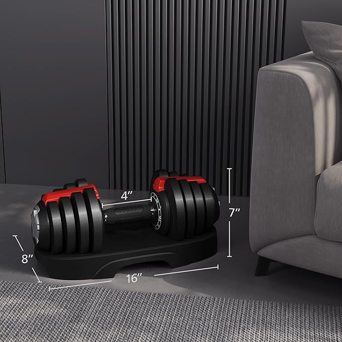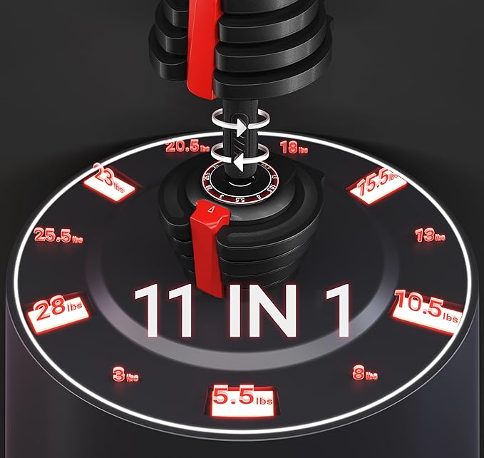 - 1-SED ADJUSTMENT FEATURE:With just a quick grip, twist, and lift of the selectorized anti-slip handle, you can easily switch the 11 adjustable weight dumbbells settings in just one second. The hassle-free customization is aided by clear dials that ensure easy readability