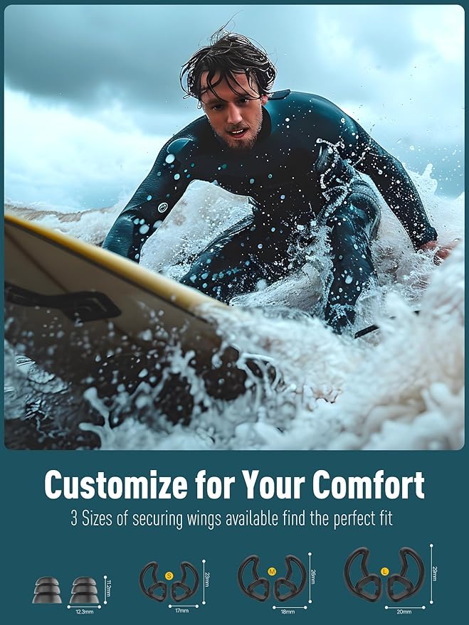 - [CUSTOM FIT]: Comes with 3 sizes of securing wings S,M,L to fit all ears with different shapes and sizes. Keeps your swim ear plugs stays in place, for swimming, shower, bathing, water skiing, kayaking, canoeing, and other water sports
