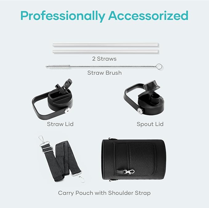 - What You Get: Buzio 64oz Water Bottle with carrying pouch, Straw Lid, Flex Lid, 2 x Straws, Bottle Brush