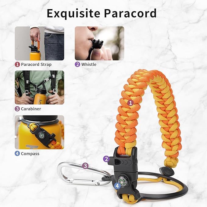 - Full-function Paracord Handle: 32 ounce water bottle come with paracord handle the brilliant paracord of matching colors bring out the bottle with a touch of youthful vibe. Compact compass and handy carabiner make the bottle the ideal survival kit for expeditions in the wild.