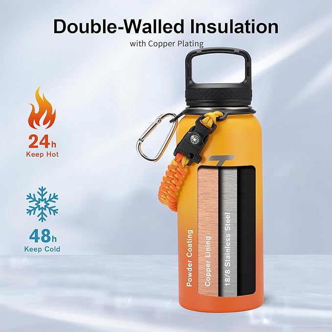 Trebo 32oz Water Bottle Insulated with Lid and Straw,Double Wall Vacuum Stainless Steel Metal Tumbler Sports Flask with Paracord Handle, Keep Hot 24 Hours & Cold 48 Hours Water Cup with 3 Lids, Orange