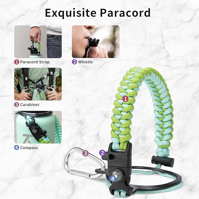 - Full-function Paracord Handle: 32 ounce water bottle come with paracord handle the brilliant paracord of matching colors bring out the bottle with a touch of youthful vibe. Compact compass and handy carabiner make the bottle the ideal survival kit for expeditions in the wild.