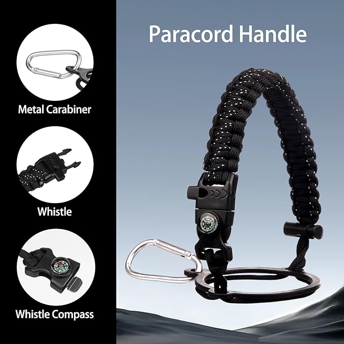 - Suitable for all occasions: This insulated water bottle comes with a beautiful hand-woven nylon paracord, and the paracord handle is equipped with a compass and carabiner and a whistle. It is a fully functional essential water bottle for camping, climbing, hiking, home use, travel, cycling, swimming fitness, and commuting
