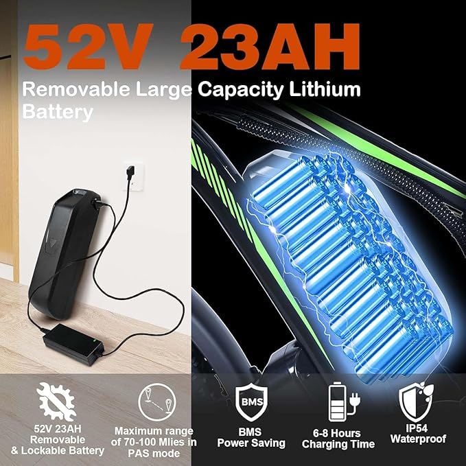 - 【52V23AH Lithium Battery Electric Bicycle with Key Code】 The e-bike is equipped with a detachable 52V 23Ah lithium battery. With a range of 70-100 miles in PAS mode and 40-60 miles in pure electric mode, it meets all the expectations of a long range electric bike! In addition, each of our electric bike has its own unique battery key code, and when you lose your key, we can provide a new key for a fee.