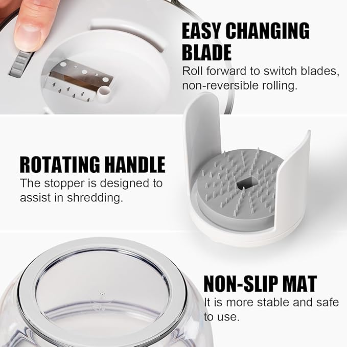 - One-Wheel Blade Selector: Innovative unidirectional wheeln of the zucchini spiralizer seamlessly cycles through 3 blades without disassembly. Simply rotate the textured dial (clockwise only) to click between 0.2" fine shredding, 0.3" shredding, and 1.4" flat cuts. Safety lock prevents accidental blade changes during use.