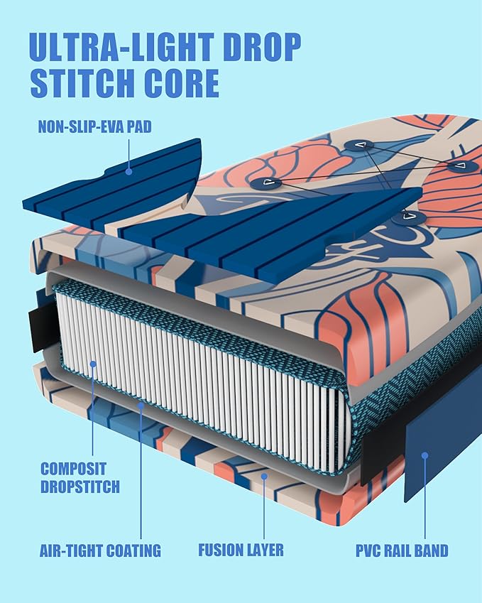 - 【Military Grade High Quality Material】Made of the highest quality military grade material. Soft anti-slip EVA deck pad greatly improved stability and safety while standing. Great family SUP - high weight capacity yet lightweight construction makes it easy for kids to carry, paddle, or ride along as passengers.