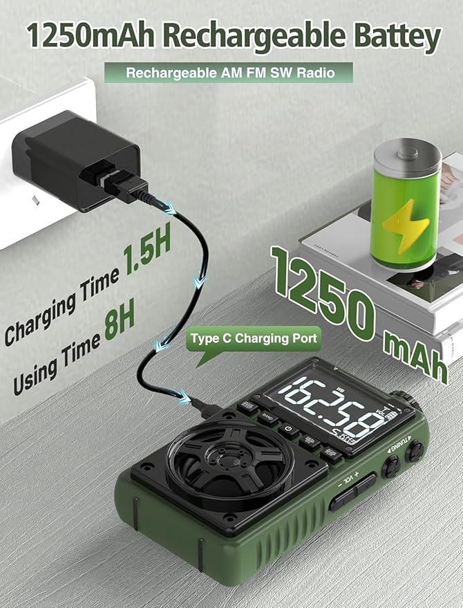 - 【1250 Rechargeable Battery&Flashlight】The rechargable shortwave radio comes with a durable built-in 1250mAh rechargeable battery,you can enjoy up to 10-12 hours of music and news on a single charge(using type-c), without the hassle of replacing batteries. Whether you're at the beach, camping, or just enjoying a picnic in the park, you can take this walkman radio with you.The rechargable AM FM radio also comes with a flashlight that allows you to illuminate the environment in case of an emergency.