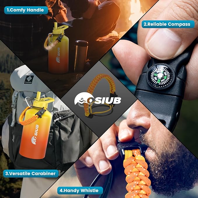 - Nighttime Navigation: Not only does the paracord handle securely grip your insulated water bottle, but it also boasts a glow-in-the-dark feature. Complete with a compass and carabiner, this multifunctional paracord handle is an essential companion for your camping or hiking adventures.