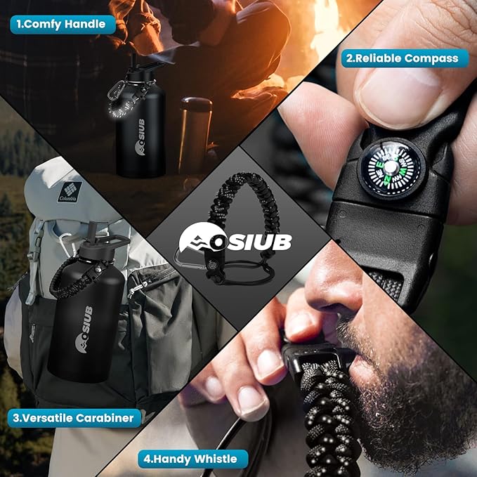 - Nighttime Navigation: Not only does the paracord handle securely grip your insulated water bottle, but it also boasts a glow-in-the-dark feature. Complete with a compass and carabiner, this multifunctional paracord handle is an essential companion for your camping or hiking adventures.