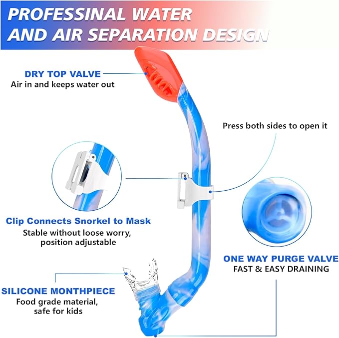- 【Thickened Tempered Glass Lens】- The Diving Goggles are made of 4.0mm HD tempered glass lens, which is much more thicker and durable than other 3.2mm lens. It is impact resistant and explosion-proof, clear and safe. Dry-top snorkels have a mechanism that prevents water from entering the tube when submerged, making them a good choice for beginners