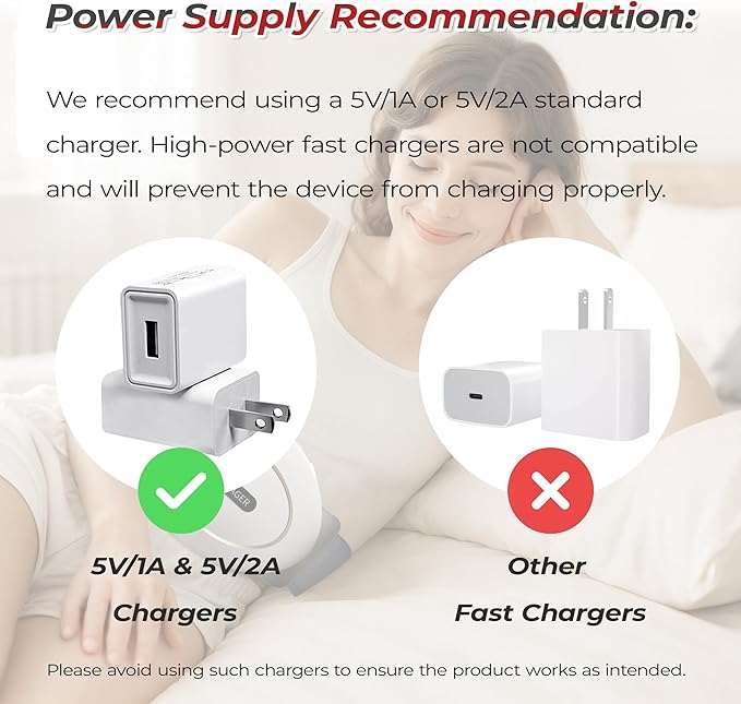 - 【Power Supply Recommendation】We strongly recommend using a 5V/1A or 5V/2A standard charger. High-power fast chargers are not compatible and will prevent the device from charging properly. Please avoid using such chargers to ensure the product works as intended.