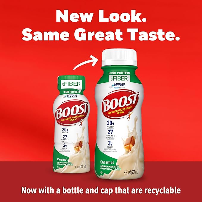 - BOOST HIGH PROTEIN with FIBER: BOOST High Protein caramel flavored protein shakes with Fiber have 20 grams of protein for muscle health, 3 grams of fiber for digestive health plus 27 vitamins & minerals with 250 nutrient-rich calories for nutritional energy