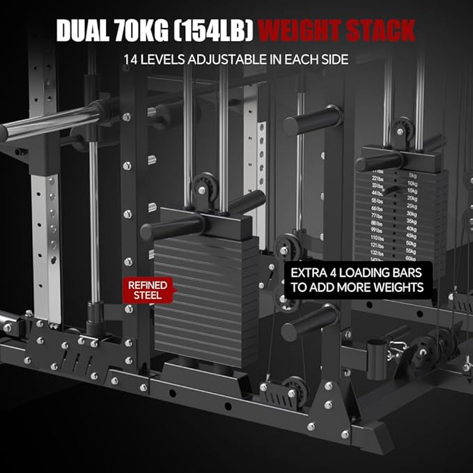 - 308LB Refined Steel Weight Stacks Design: This functional trainer comes with 308lb weigth stacks (154lb each side) made of refined steel, which ensures for the long term use. Each counterweight system has 14pcs weight stacks (11lb for each) and 1pc top block (about 6lb). The two loadings bars on the top block allow you to add extra weights to meet heavy-weight training.