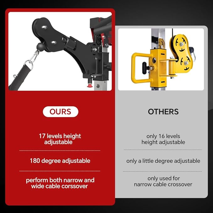 - 180 Degree Rotatable Cable Crossover: Unlike others on the market, our cable crossover attachments on this machine adopts a specific patented design, which are 180 degree rotatable, allowing you to perform both narrow and wide cable crossover to build strength on different muscle groups. The 1:1 ratio lat pull down helps you to achieve a more efficient workout in daily strength training.