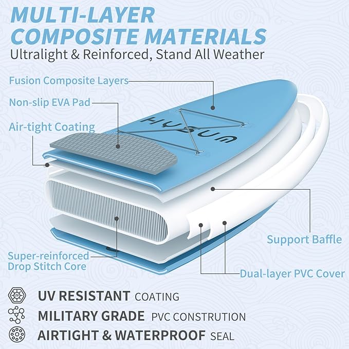 - HIGHLY DURABLE MATERIALS - HYSUM's paddle boards are made of the highest quality military grade materials. With reinforced drop stitch as the core, it can withstand a lot of pressure. The ultra light double wall PVC is 25% lighter than other products of the same size, while this lightweight fabric has excellent abrasion resistance, toughness and long lifespan. The soft, non-slip EVA deck pad keeps you comfortable while ensuring your stability and safety when you stand for a long time.