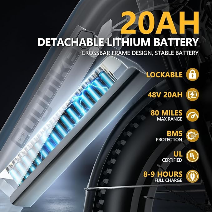 - ๐๐๐ ๐๐๐๐ก ๐๐จ๐ง๐ ๐๐๐ง๐ ๐ ๐๐๐ฆ๐จ๐ฏ๐๐๐ฅ๐ ๐๐๐ญ๐ญ๐๐ซ๐ฒ:Not only the excellent motor but also an upgraded battery equipped. The 48V 20Ah lithium-ion battery covers a range of 40-80 miles per full charge. The removable battery design makes charging more convenient. Dustproof and dampproof, guarantee the safety and life of the battery. Effortlessly cruise, exercise, or commute seamlessly with this long range e-bike.