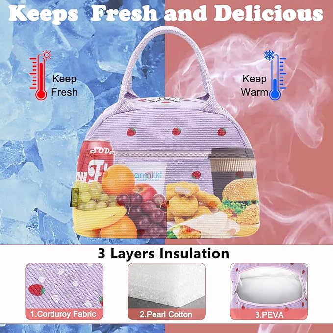 FlowFly Insulated Lunch Bag for Women – Corduroy Lunch Tote Box, Cute Cooler Bag for Work, Travel, Picnic,Corduroy Strawberries Purple
