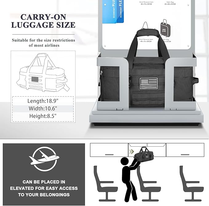 - Flight Friendly Size: The carry on bag dimension is 18.9*8.5*10.6inch, meet the flight regulations and requirements for carry on luggage, it fits perfectly in the overhead compartment. The 3 back portable pockets can hold your phones, ID cards or passports. This travel bag is the perfect companion for your short-term travel.