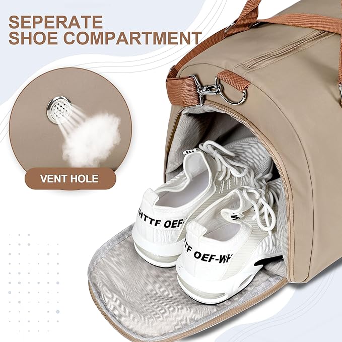 FIORETTO Womens Gym Tote Duffle Weekender Bag with Wet Pocket & Shoe Compartment, Ideal for Travel, Swimming, Dance, Khaki