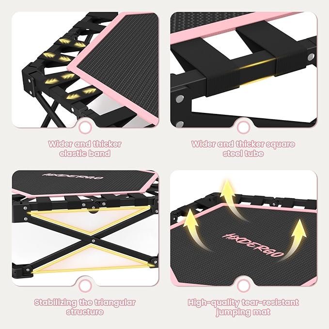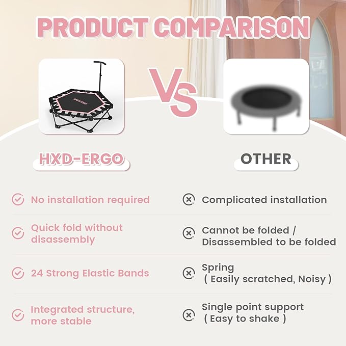 - Comfort & Stability: The HXD-ERGO Foldable Trampoline is designed for home use, featuring high-quality tear-resistant bouncy fabric and a stable hexagonal one-piece reinforced frame capable of supporting up to 460 pounds. It uses 24 durable elastic bands instead of springs, offering a safer and quieter experience— even if you step on the frame, it's less likely to cause injury. This fitness trampoline provides a more comfortable jumping experience.
