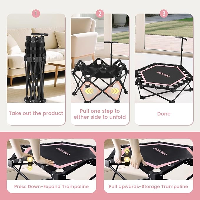 - No installation fitness trampoline, open it and use it immediately. Hexagonal folding quick design, quickly unfolds for storage.
