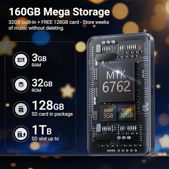 - 160GB HIGH CAPACITY - Android MP3 Player has built-in storage space of 3GB RAM and 32GB ROM to ensure smooth running of the program. In addition, it comes with a 128GB SD card to store all the songs you've cherished over the years, freeing up your phone's memory. The MP3 player also comes with a memory expansion slot of up to 1TB capacity to fulfill users' storage needs.