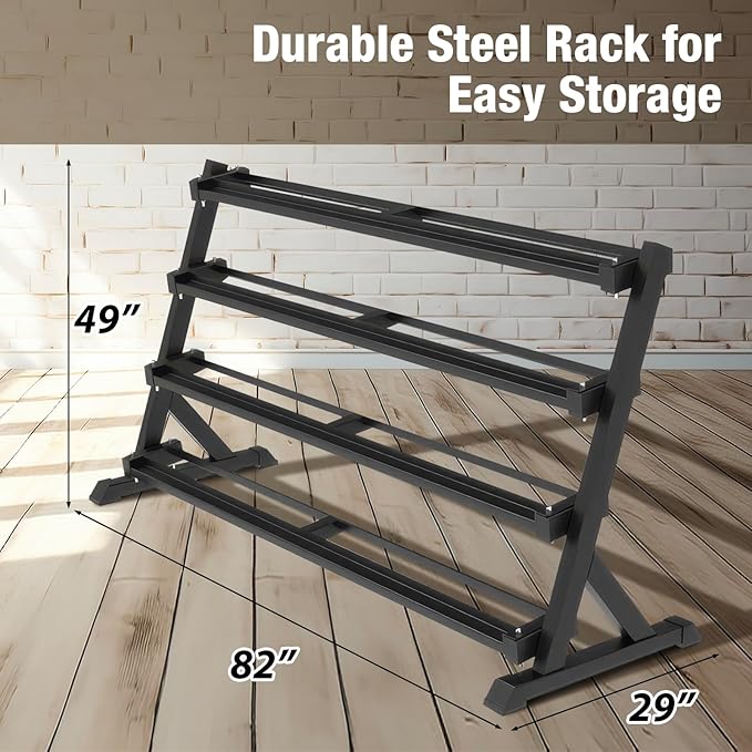 - Space-Saving Design: The Commercial Grade 4-tier dumbbell rack is designed to optimize floor space in your gym. Its compact 4-tier angled layout makes your complete set of 5 to 100 lb. hex dumbbells easily accessible while keeping your workout area organized and clutter-free
