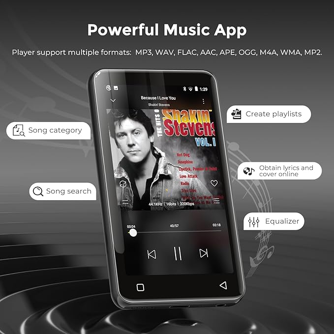 - Play your favorite songs: This MP3 player with spotify features a powerful music app that supports many formats (MP3, WAV, FLAC, AAC, APE, OGG, M4A, WMA, MP2, etc.). Use the music scan feature to load songs from folders with one click and create unlimited playlists. Easily find songs by typing name. The mp3 also has a noise reduction chip for an ultimate sound experience.