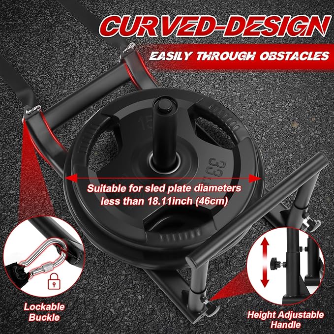 - Innovative Design - The weight sled features an arc shape design for easy over obstacles, it can better protect the training ground. The design of the adjustable height handle can meet different training pose needs. It's ideal for football training, strength exercises, or speed and power fitness training.