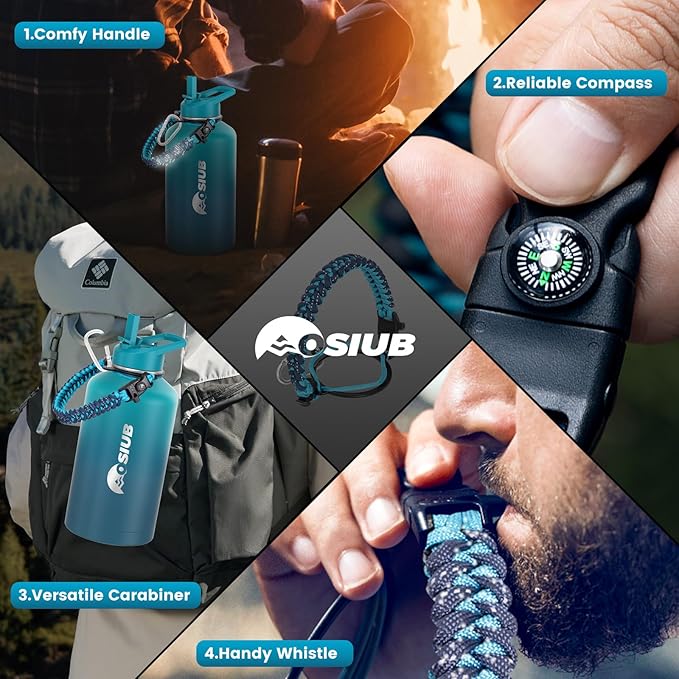 - Nighttime Navigation: Not only does the paracord handle securely grip your insulated water bottle, but it also boasts a glow-in-the-dark feature. Complete with a compass and carabiner, this multifunctional paracord handle is an essential companion for your camping or hiking adventures.