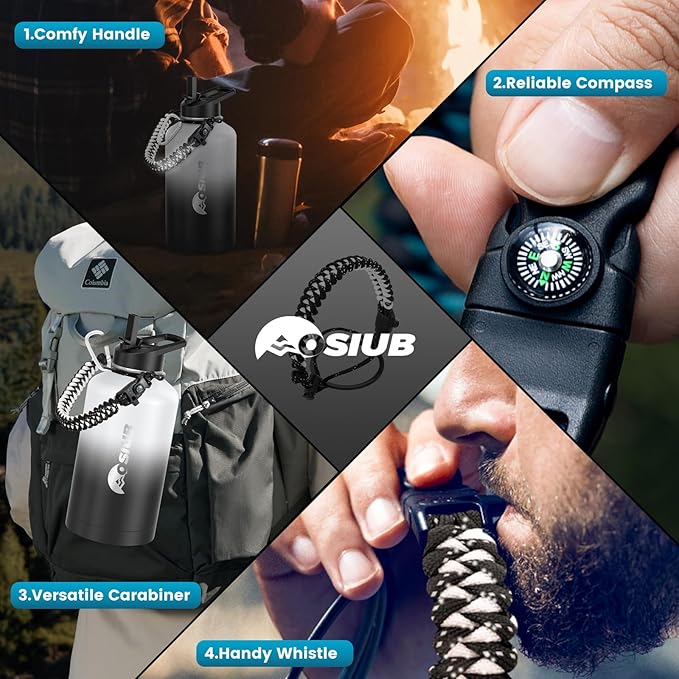 - Nighttime Navigation: Not only does the paracord handle securely grip your insulated water bottle, but it also boasts a glow-in-the-dark feature. Complete with a compass and carabiner, this multifunctional paracord handle is an essential companion for your camping or hiking adventures.
