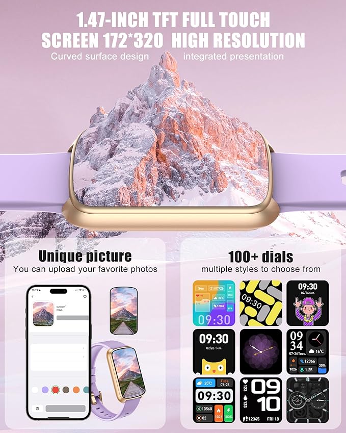 - 【1.47" Touchscreen & 200+ Dials】Enjoy a crystal-clear 1.47-inch TFT display with brilliant clarity and responsive touch control. The GloryFit app offers over 200 stylish watch faces, plus the option to upload your own photo for a personalized look. This feature-rich display seamlessly combines advanced functionality with custom style, elevating your smart watch experience.