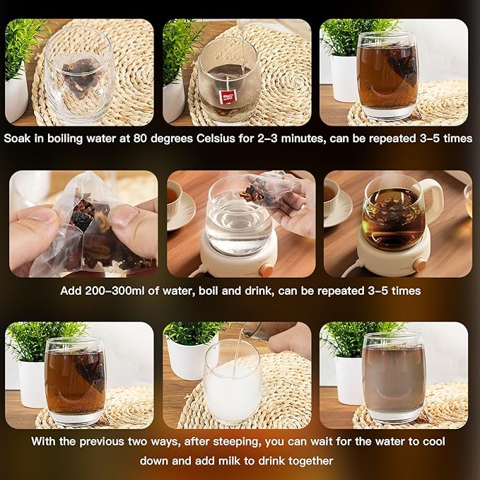 - Caffeine-Free & Versatile Brewing Hot Tea: Steep 1 tea bag in 8 oz hot water (200°F) for 5-7 mins. Boil & Simmer: For stronger flavor, simmer 1 tea bags in 2 cups water for 10 mins. Iced or with Milk: Cool and serve over ice, or add warm milk for a creamy, soothing drink.