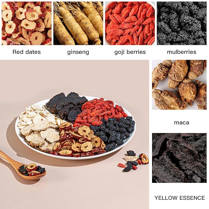 - Traditional Herbal Blend with Ginseng & Maca Root A time-honored combination of ginseng, maca root, astragalus, and goji berry, crafted for natural wellness.