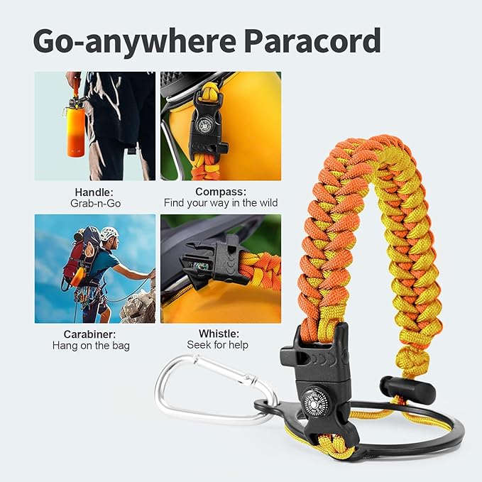 - Palm Fitting Paracord Handle: Compared to handle lids, nylon paracord on the bottle gives you more choices in terms of color coordination and coziness on your hands. Match the handle with your bottle to make a complete outdoorsy look. Compass and carabiner can be lifesavers for hiking and other expeditions