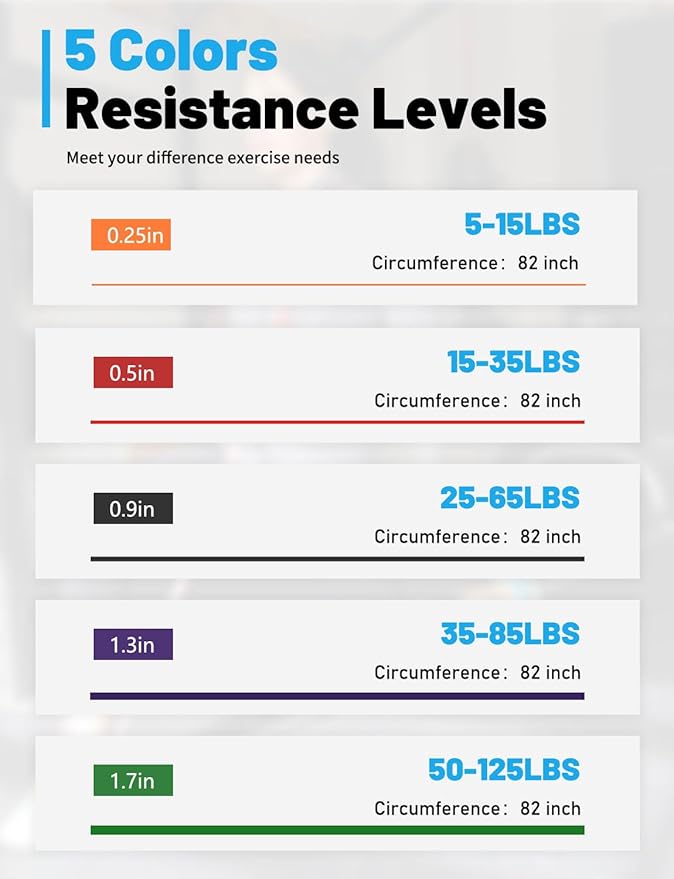 - For All Strength Level: 5 different strength levels :5-15 lbs, 15-35 lbs, 25-65 lbs, 35-85 lbs, 50-125 lbs, these exercise bands will help you upgrade your fitness training from a newbie to a veteran. These fitness bands can be used alone or combined multiple workout bands to increase the challenge. Start now and build your dream body
