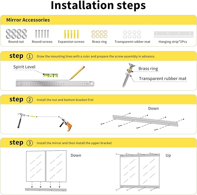 - Effortless Wall Mount Installation:Enjoy hassle-free setup with included J-bar brackets and step-by-step video guidance. Designed for flat walls including tile, brick, wood or painted surfaces, our secure mounting system keeps mirrors firmly in place with all necessary hardware pre-packed for quick installation without needing professional help.