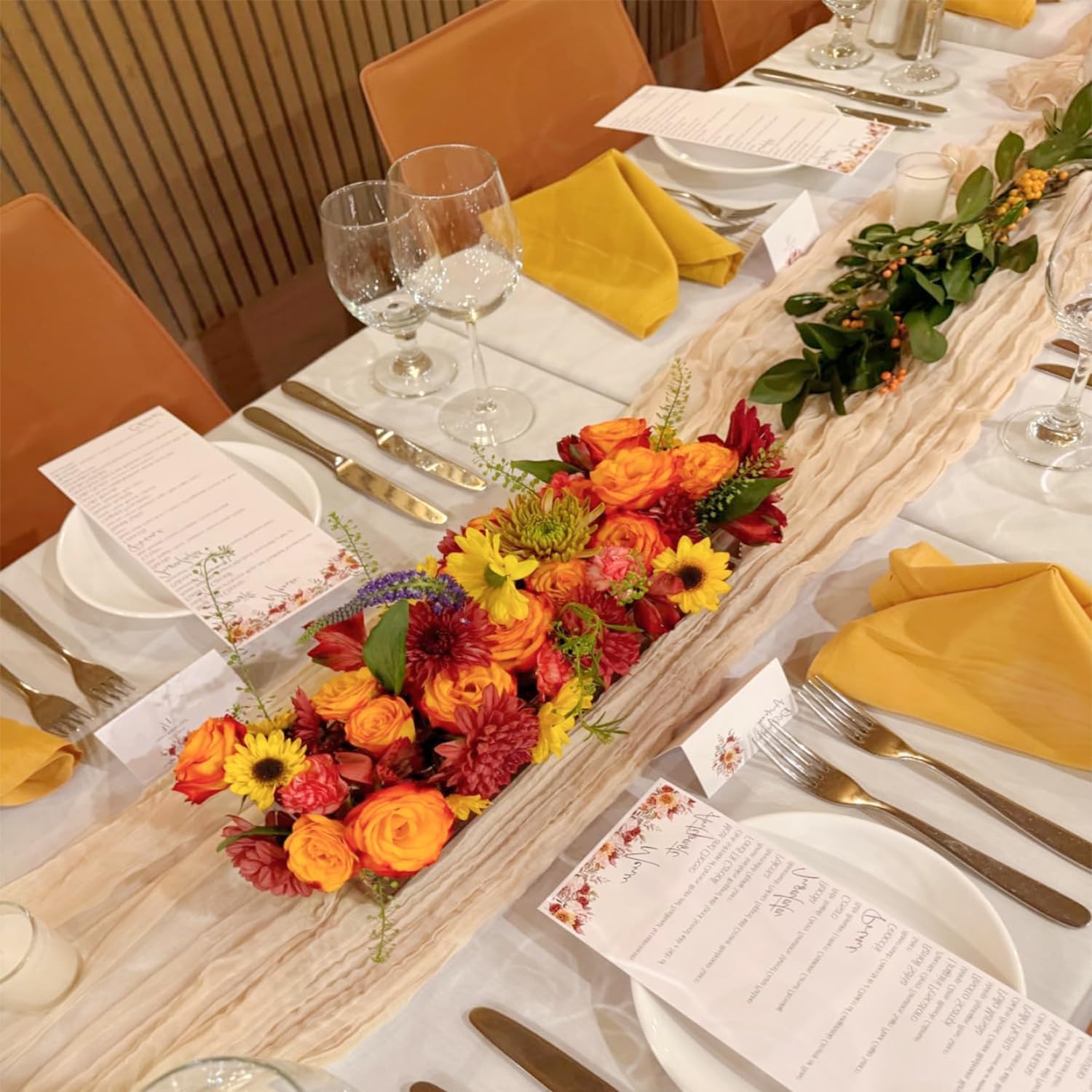 - đ„ăReusable & SoftăThese romantic beige table runner is made of premium cheese gauze fabric with beautiful crinkling. Soft feeling, reusable, washable and fade resistant. These beige cheesecloth table runner adopt unique pleated workmanship, adding a touch of romantic and elegant to your events. The boho wedding table runner is sheer, natural drape, lightweight and skin-friendly. Soft table linen with gorgeous finished edges drapes gracefully across your banquet table, adds to romantic, delicate, and flowy vibe.