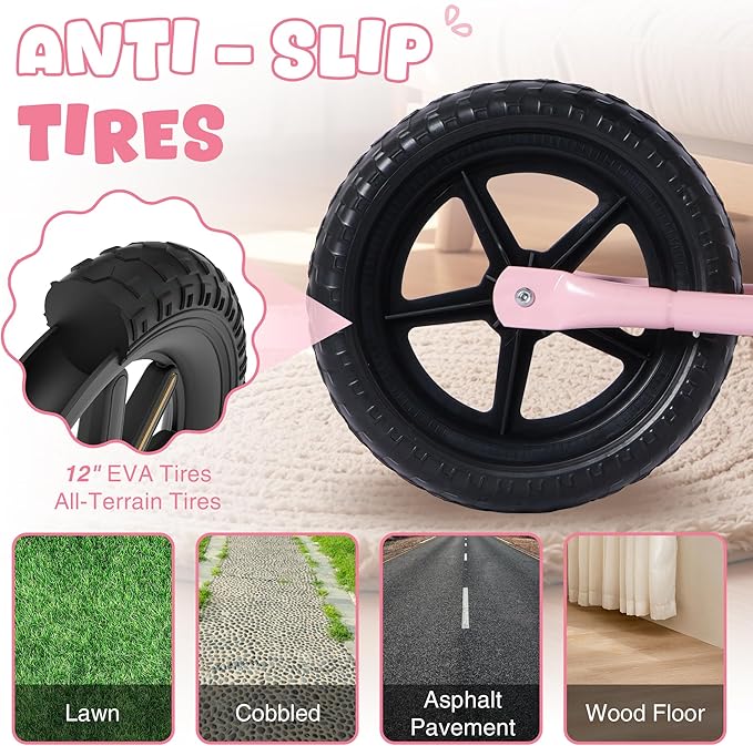 - Multi-Terrain Use Tires: Equipped with durable 12 inch EVA tires, this balance bike can easily navigate various surfaces, such as asphalt pavement, lawn, cobbled, and wood floor, making it perfect for adventures.