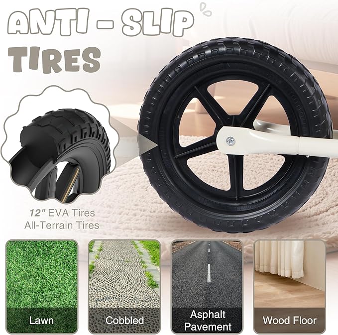 - Multi-Terrain Use Tires: Equipped with durable 12 inch EVA tires, this balance bike can easily navigate various surfaces, such as asphalt pavement, lawn, cobbled, and wood floor, making it perfect for adventures.