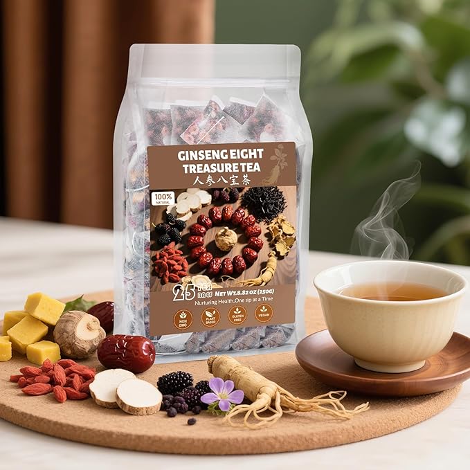 - Ginseng Eight Treasures Tea:Ginseng and Wolfberry Tea has a mellow taste, you can smell the aroma of jujubes and goji berries after steeping, and the tea broth is dark in color and excellent in quality. Naturally caffeine free, it can be consumed at any time of the day